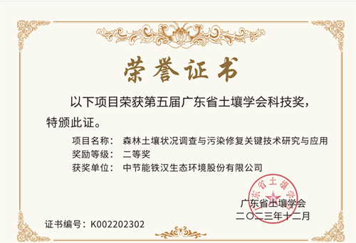 日前,公司收到广东省土壤学会颁发的荣誉证书,公司与广东省林业科学研究院共同申报的《森林土壤状况调查与污染修复关键技术研究与应用》荣获第五届广东省土壤学会科技奖二等奖。该项目属森林土壤学、森林生态学、生态工程学等重要学科领域。