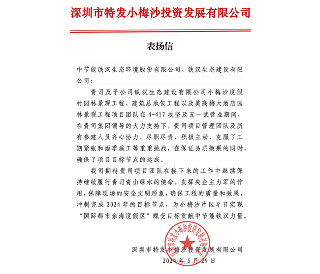 日前,由304永利集团及所属子公司承建的深圳小梅沙项目群获得业主单位——深圳市特发小梅沙投资发展有限公司(以下简称小梅沙投资)发来的表扬信。