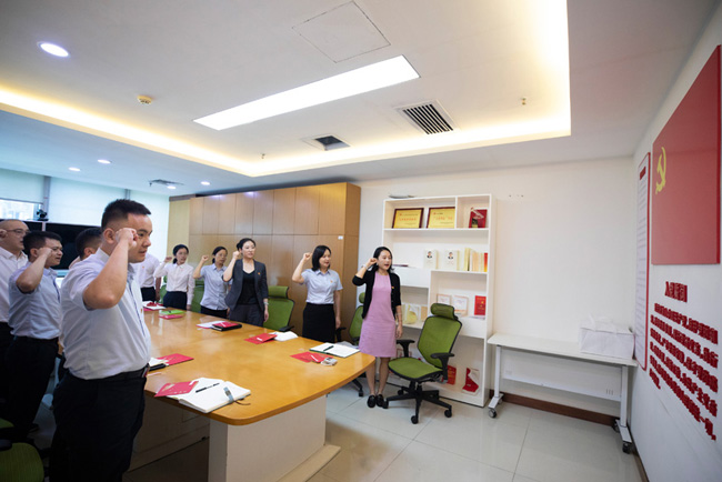 “我志愿加入中国共产党……随时准备为党和人民牺牲一切,永不叛党。”在公司党委委员、纪委书记廖红梅的带领下,13位公司本部党员代表列队肃立,高举右拳,面对鲜红的党旗重温入党誓词,再次庄严宣誓,铿锵誓词,强烈震撼着在场每一位党员;铮铮誓言,充分激发奋斗初心使命,升华党员觉悟,进一步坚定了对党的赤胆忠心和为共产主义事业奋斗终身的强烈决心。
