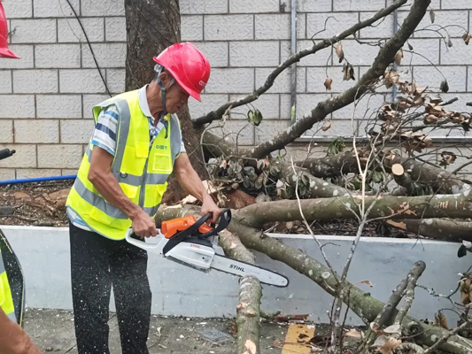 新坡镇救灾现场,304永利集团小分队根据当地政府部门统一部署,在分配区域全速抢通阻断路段,争分夺秒对倒伏树木进行分解清理,并及时清理道路垃圾,开展卫生整治工作。