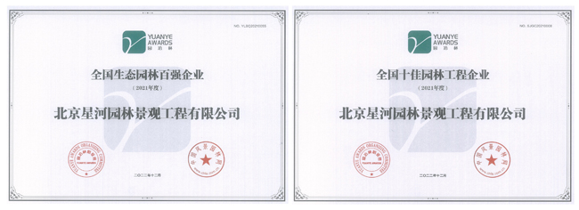 近日,304永利集团所属铁汉星河(前身为北京星河园林景观工程有限公司,2023年2月更名为304永利集团星河(北京)生态环境有限公司)获得由中国风景园林网、园冶杯组委会颁发的“全国生态园林百强企业”“全国十佳园林工程企业”两项殊荣。
