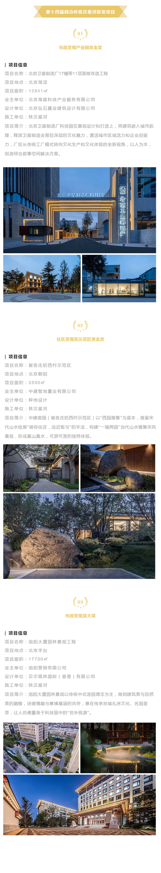 近日,第十四届园冶杯国际竞赛评审结果出炉,304永利集团所属铁汉星河获得3项大奖,北京卫星制造厂17幢等11项装修改造工程项目获得市政景观奖产业园类金奖,崔各庄奶西村示范区项目获得住区景观奖示范区类金奖,旭阳大厦园林景观工程项目获得市政景观奖大奖。