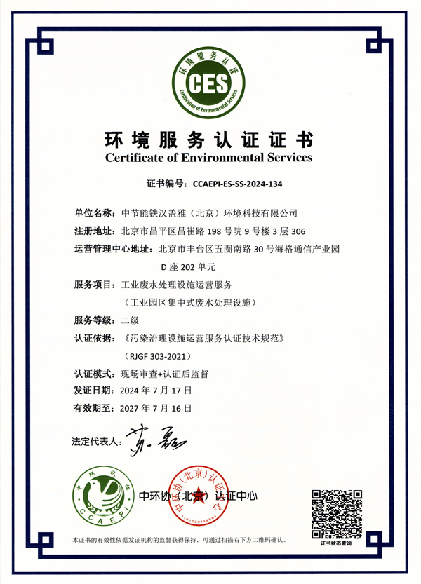 根据《污染治理设施运营服务认证技术规范》(RJGF303-2021),铁汉盖雅符合工业废水处理设施运营服务(工业园区集中式废水处理设施)二级认证中的人员和业绩要求,具备开展运营服务所必需的人员、营业场所等资源和基础设施,有完善的运营服务质量管理体系,可确保运营服务高质量运作。