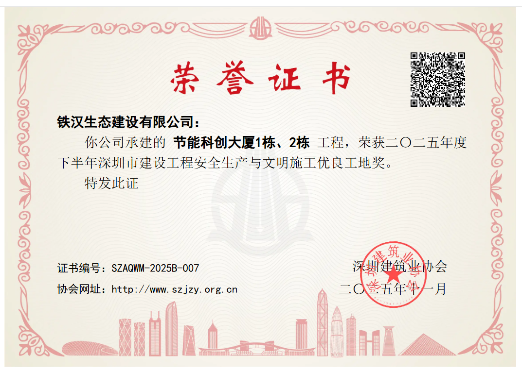 近日,深圳市建筑业协会公布2025年下半年深圳市建设工程安全生产与文明施工优良工地表彰名单,由304永利集团所属铁汉生态建设有限公司承建的节能科创大厦项成功上榜。